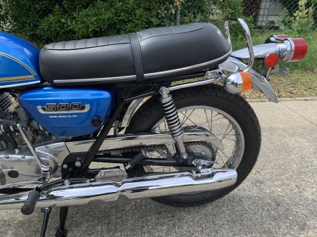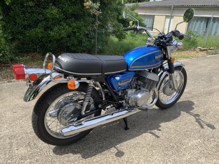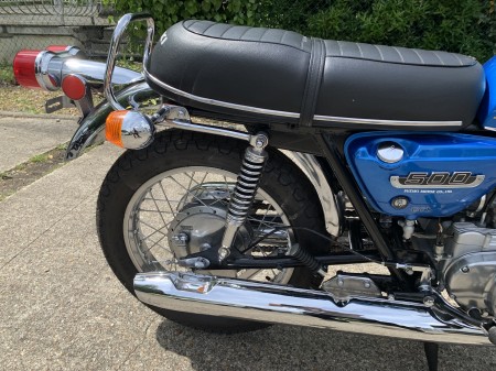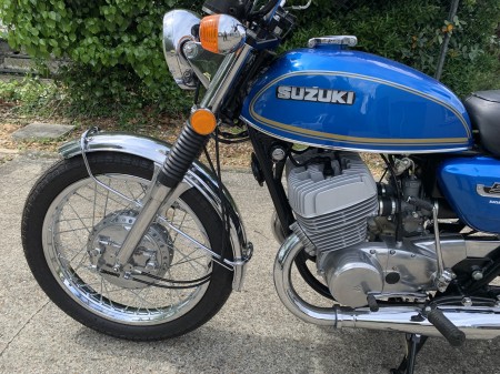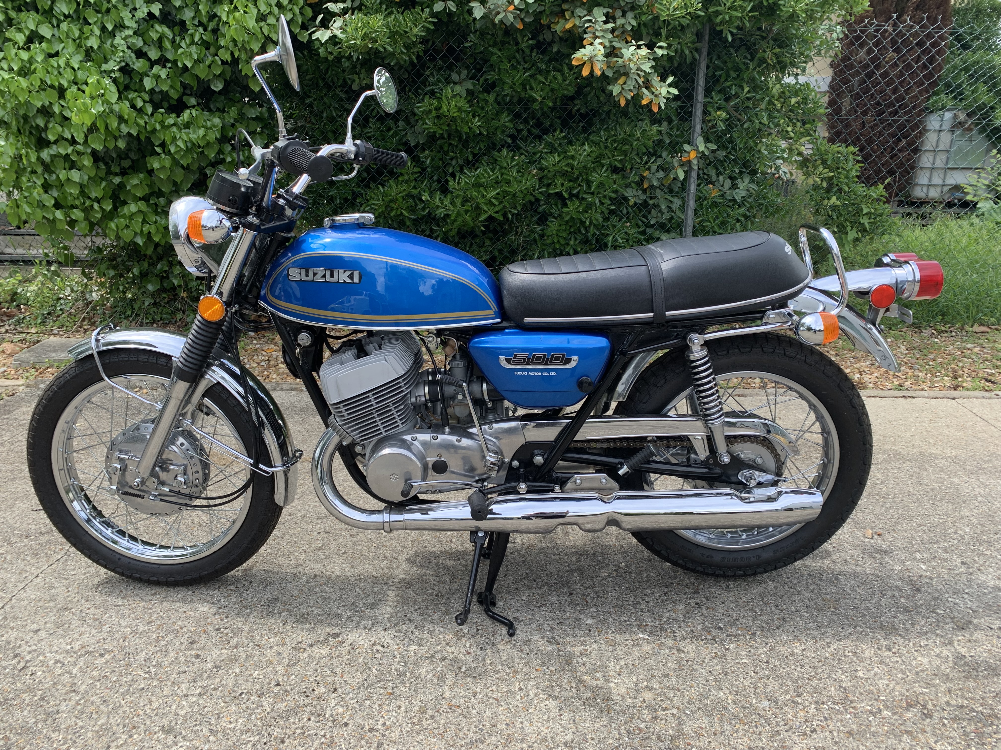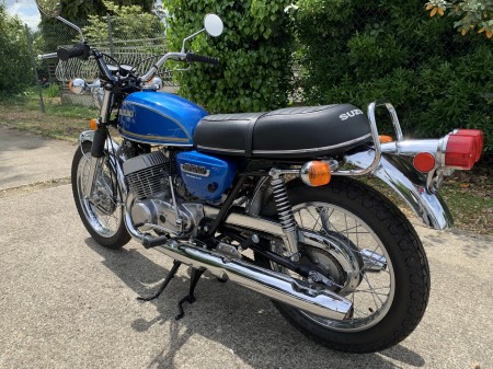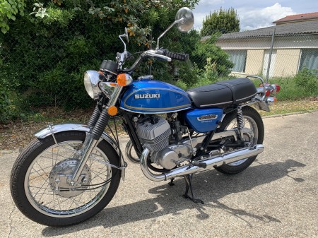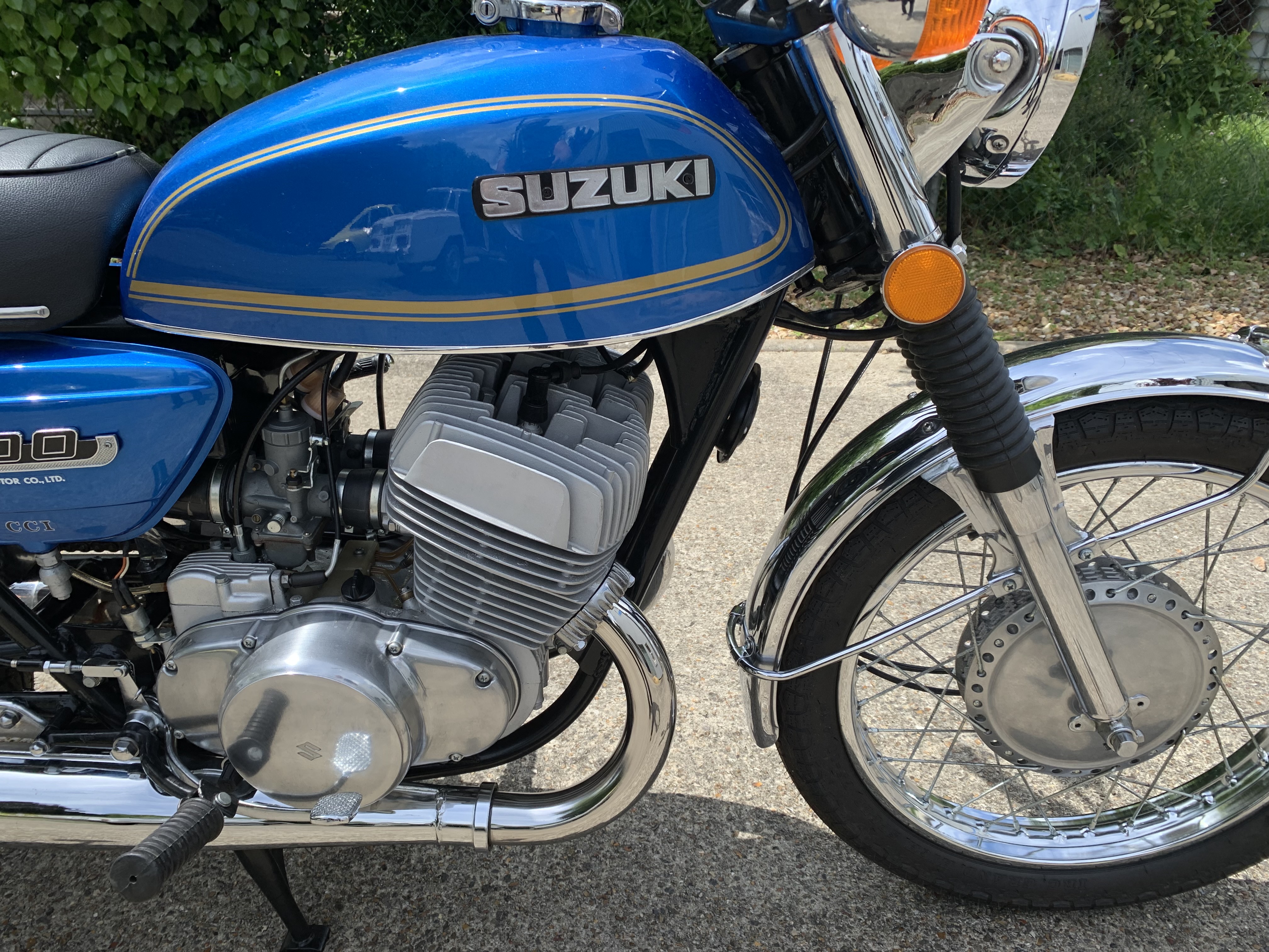 Suzuki T500M,dernière génération du mythique gros bicylindre 2 temps équipe du frein à tambour avant,cette moto a été restaurée et n a pas roulé depuis,elle est visible à notre atelier ,vendue avec une carte grise française de collection,je peux livrer à votre domicile.